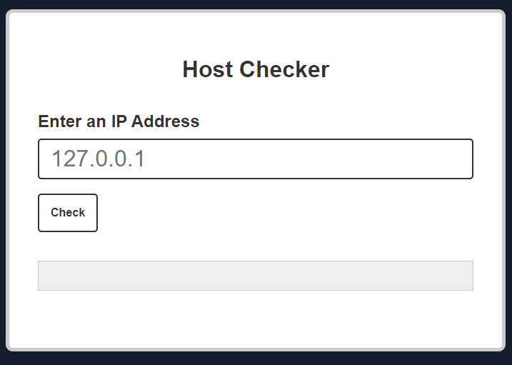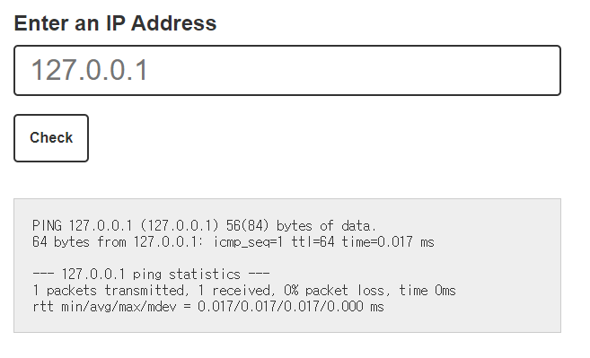 위 사진에서는 IP를 입력받아 해당 IP가 활성 상태인지 확인하는 Host Checker 기능을 사용할 수 있다. localhost의 IP인 127.0.0.1을 입력해보면 ping 명령어가 결과를 반환하게 된다.